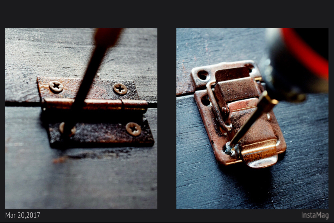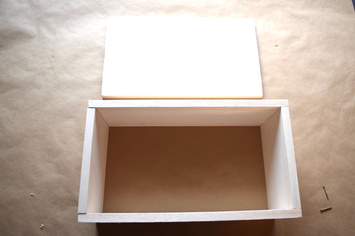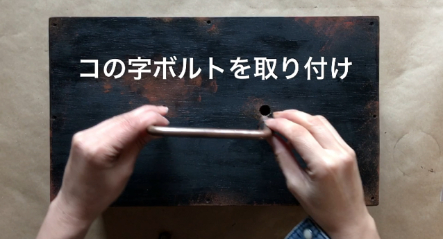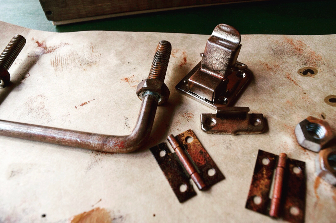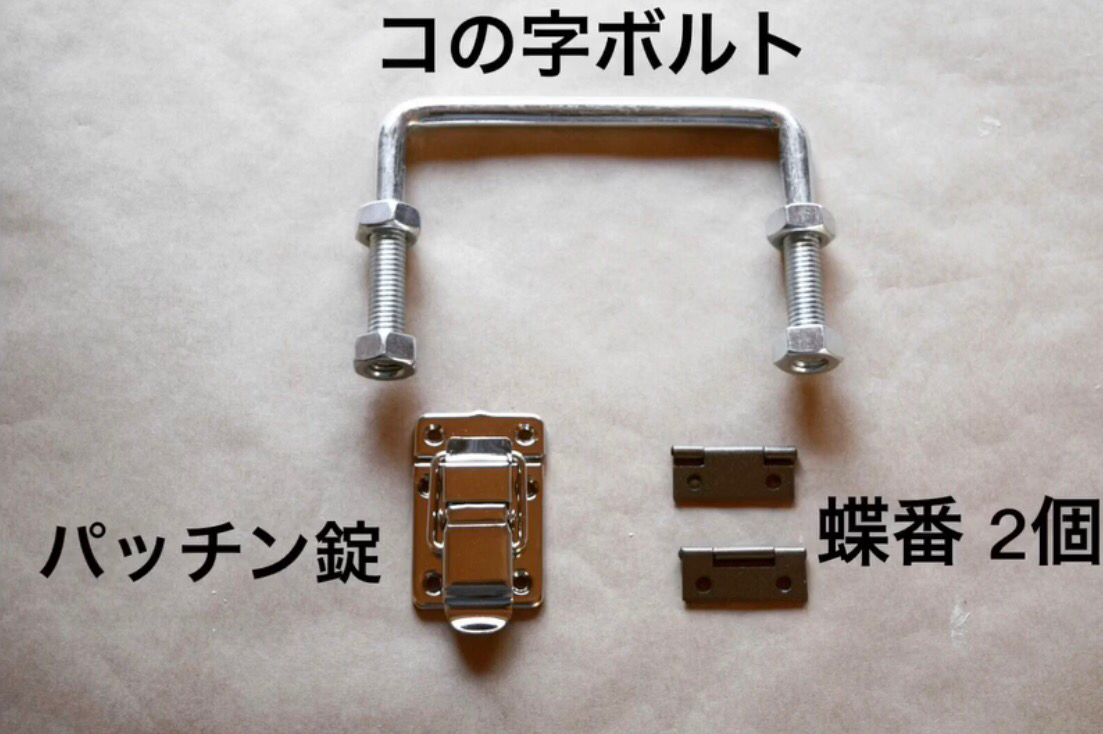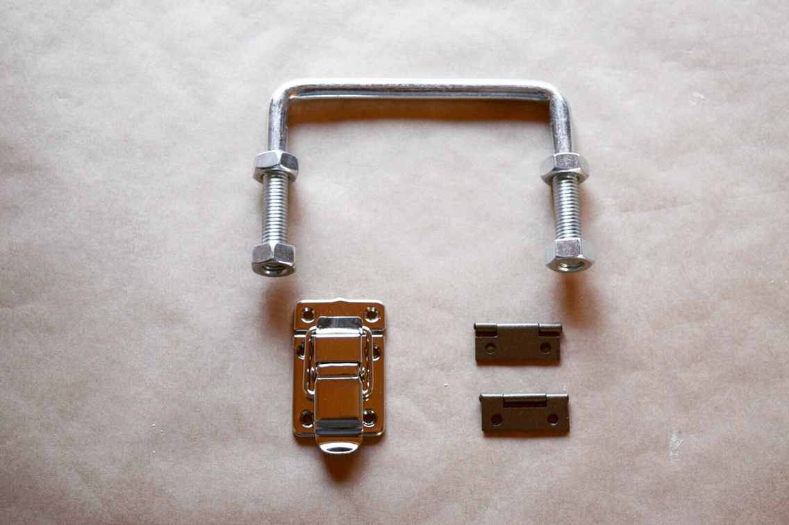 蓋と本体を繋ぐ蝶番とパッチン錠を取り付けします。