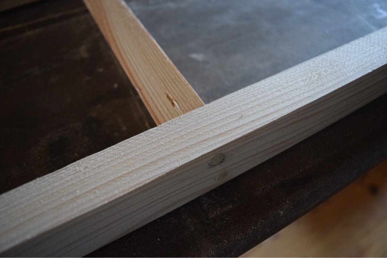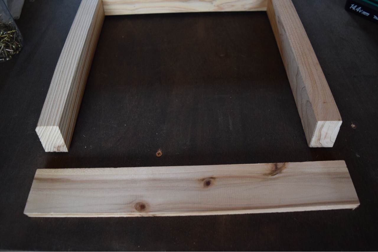 横の短い角材を内側の印にあわせて、