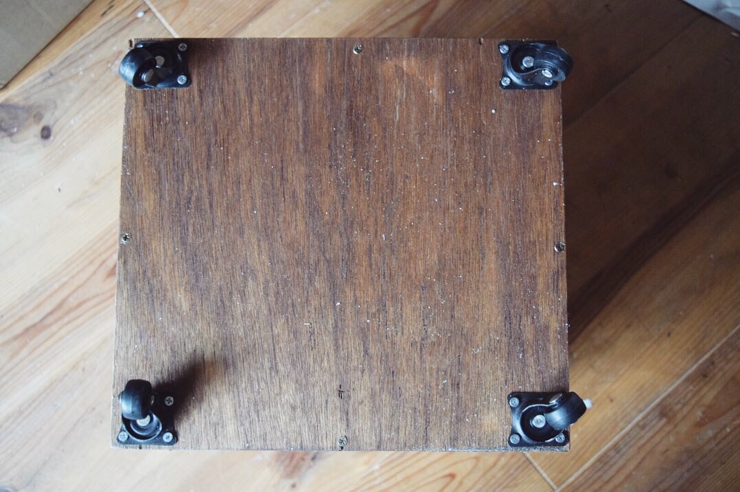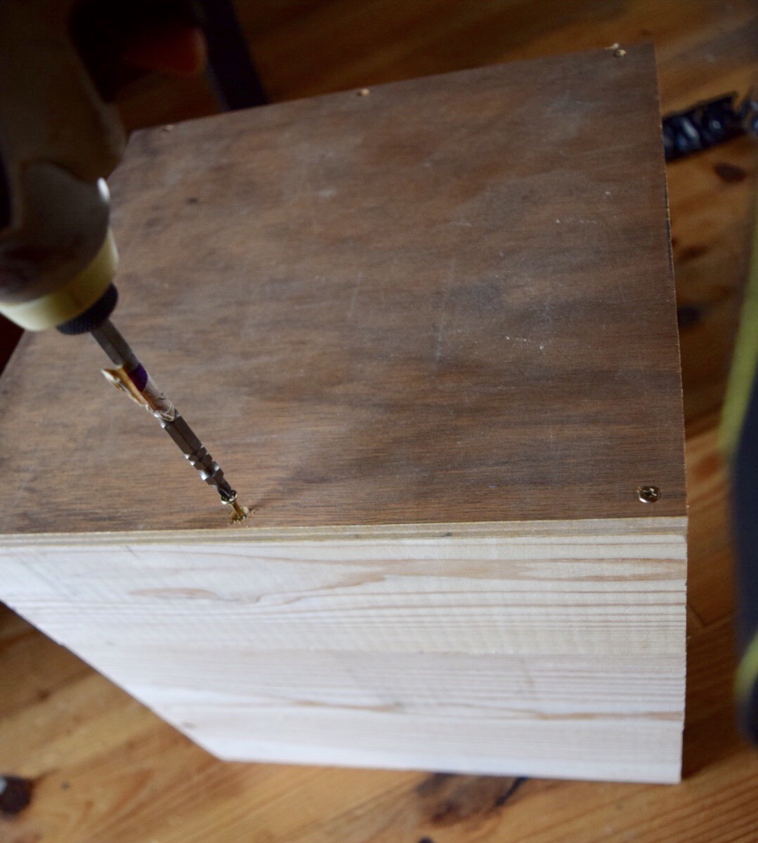 上から底板の合板を被せて、ビスで留めていきます。
