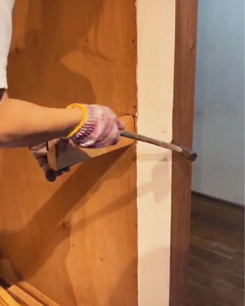 金槌で端を下から叩いて、釘ごと桟を外します。